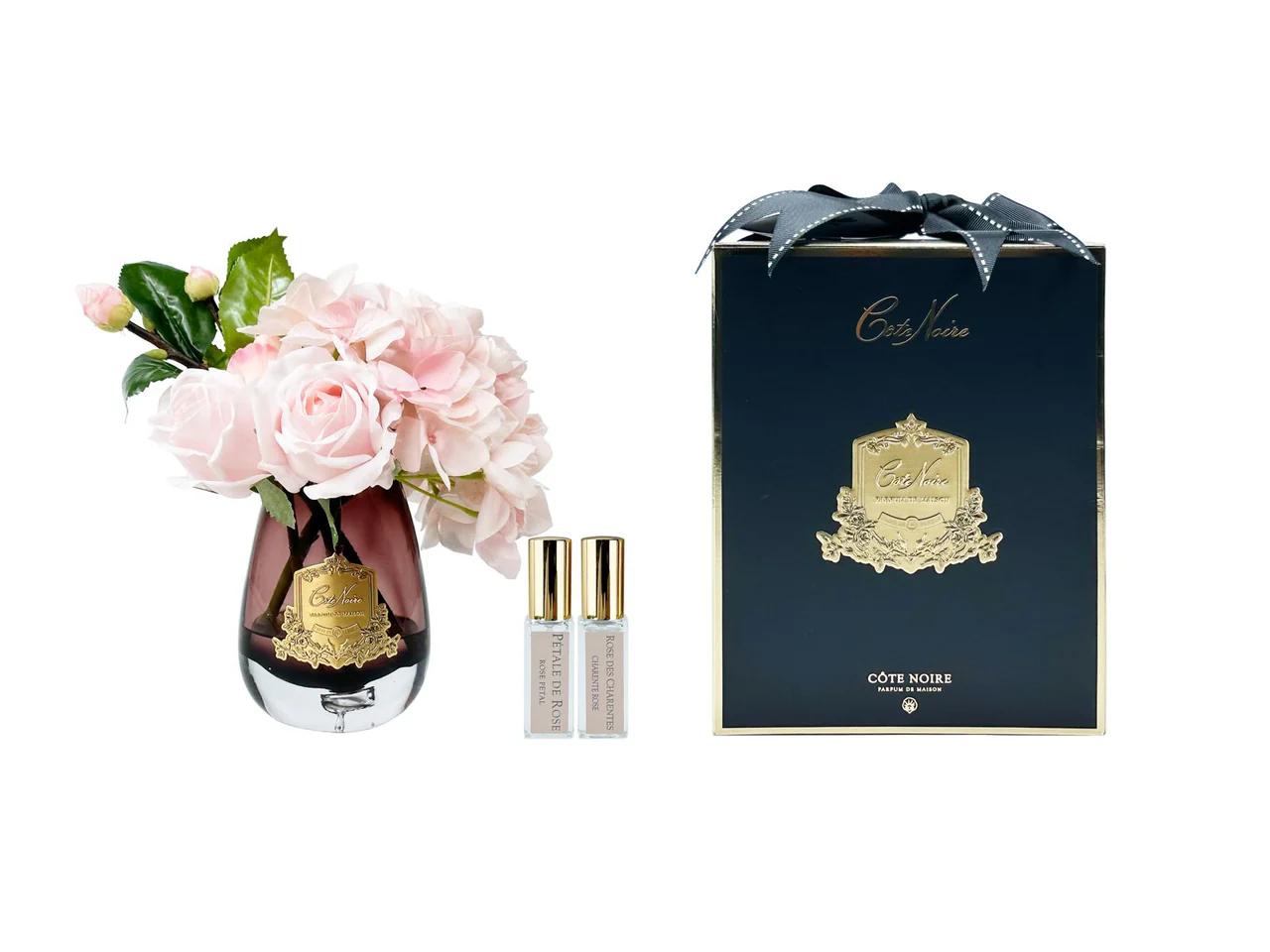 Rose drammatiche abbinate a boccioli abbinati in un bellissimo vaso a goccia fatto a mano con distintivo dorato, accompagnato da un profumo di rosa Charente e petali di rosa.